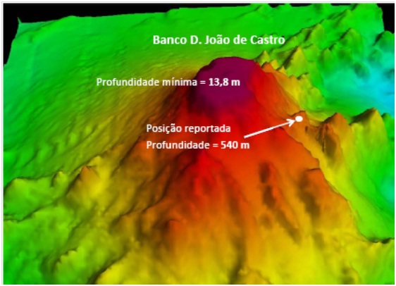 | O banco submarino D. João de Castro e a posição reportada da pirâmide subaquática IH |