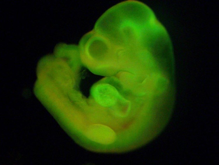 | Neste embrião de ratinho, as células criadas com a nova técnica (fluorescentes) participaram no desenvolvimento de todo os órgãos HARUKO OBOKATA |