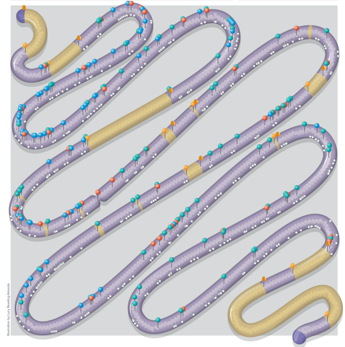 | Desenho do cromossoma artificial, com as alterações assinaladas por "alfinetes", pontos brancos e zonas clarasLUCY READING-IKKANDA |