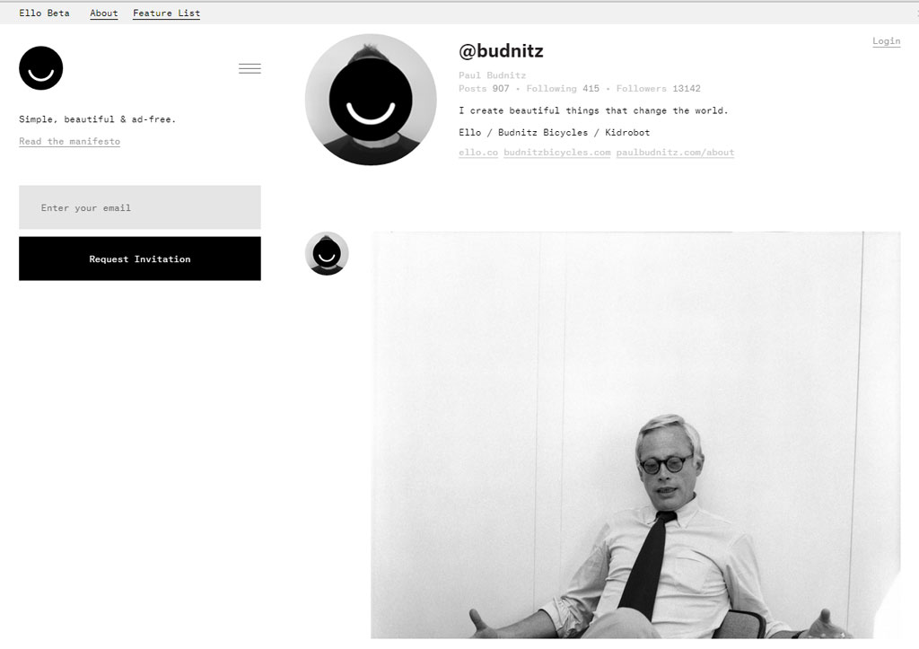 Com um simples smile preto e branco, o Ello apresentou-se ao mundo onlinecomo uma alternativa “simples, bonita e sem anúncios” às redes sociais convencionais, aberta a todos mas com um toque de exclusividade. Para se aceder à rede social é necessário ser convidado por um utilizador ou que o pedido de entrada seja aceite pela equipa responsável pelo Ello. Aqueles que já sejam utilizadores apenas poderão enviar entre cinco a dez convites.