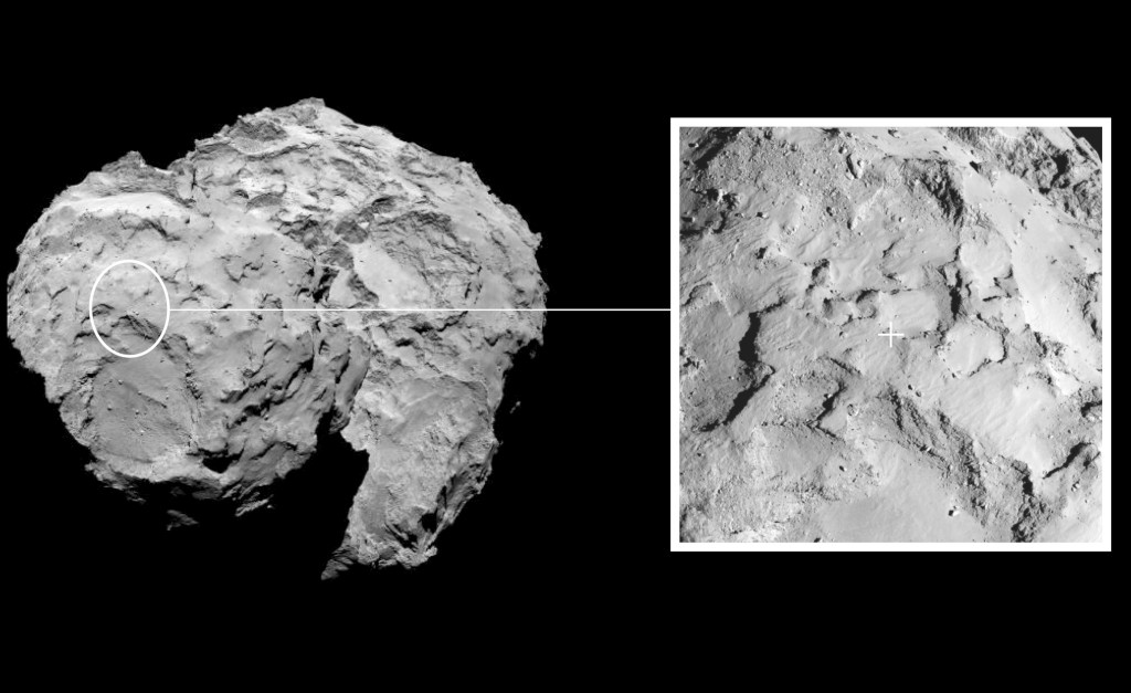 A escolha do lugar foi sendo feita com a informação obtida desde 6 de Agosto, quando a Roseta ficou apenas a 100 quilómetros de distância do 67P/Churyumov-Gerasimenko. Desde então a sonda aproximou-se até ficar a uma distância de 30 quilómetros. Primeiro foram escolhidos dez locais e destes já só cinco foram anunciados. Segundo a ESA, o lugar J oferece o risco mínimo para o módulo em comparação com os outros locais candidatos e é também cientificamente interessante, com sinais de actividade por perto. A seguir ao local J, o mais bem classificado e, portanto, a segunda hipótese se algo correr mal, é o local C, que fica localizado no corpo do cometa.