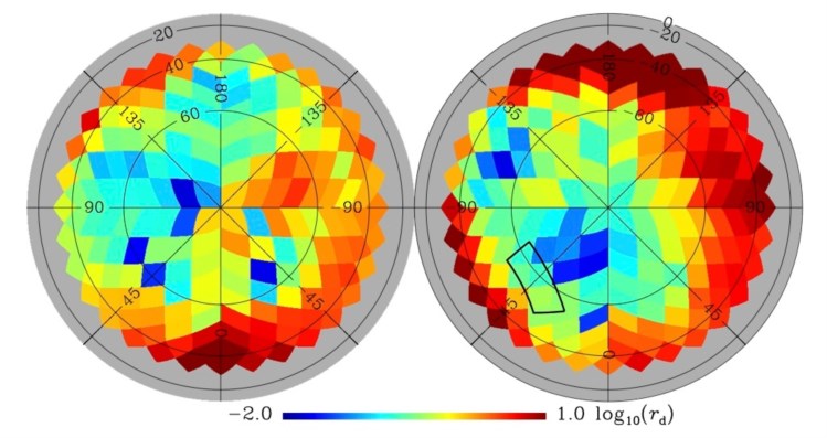 | No novo mapa do Planck, a “janela” de mira do BICEP (rectângulo preto na imagem da direita) fica numa região do céu austral mais turva do que previsto DR |