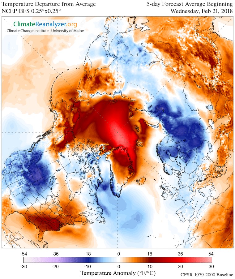 Mientras en Europa hace frío, aquí un recordatorio de que la temperatura en el Ártico es 20°C grados más cálida de lo normal. Imagen por @ZLabe. Compara la línea roja para 2018 con la blanca de la temperatura promedio. #CambioClimático
